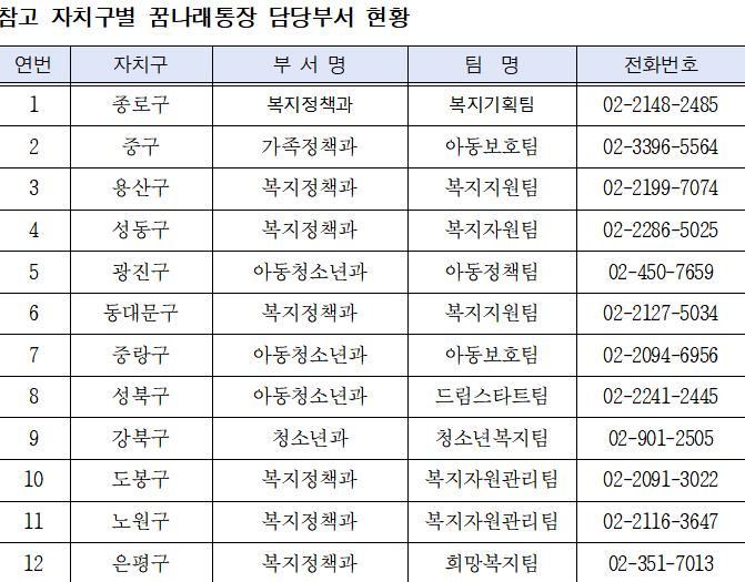 각 자치구별 꿈나래통장 담당부서 전화번호가 있으니 확인해보시기 바랍니다.